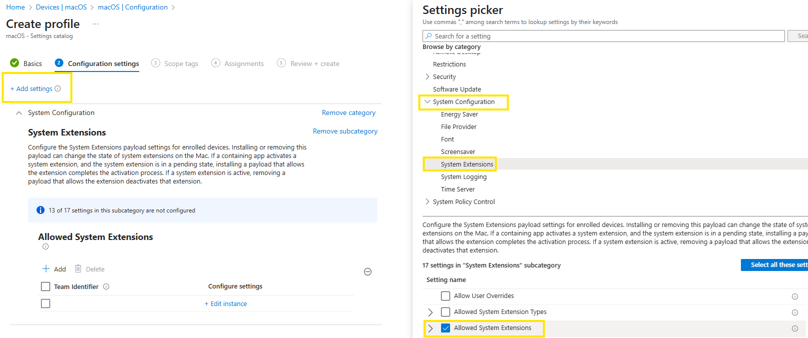 In the Settings picker, expand the System Configuration category, and then select System Extensions and check Allowed System Extensions
