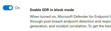 EDR Block Mode: EDR Block mode allows Defender for Endpoint to block malicious activities and files even if the primary antivirus solution misses them. This mode enhances security by leveraging Endpoint Detection and Response (EDR) capabilities to prevent threats that might bypass other defenses. It is recommended to use this mode on top of passive mode alongside the existing antivirus solution to provide an additional layer of protection by blocking high-confidence malicious behaviors and files. It is recommended to enable EDR block mode even though running in active mode, to ensure that all capabilities are in place.